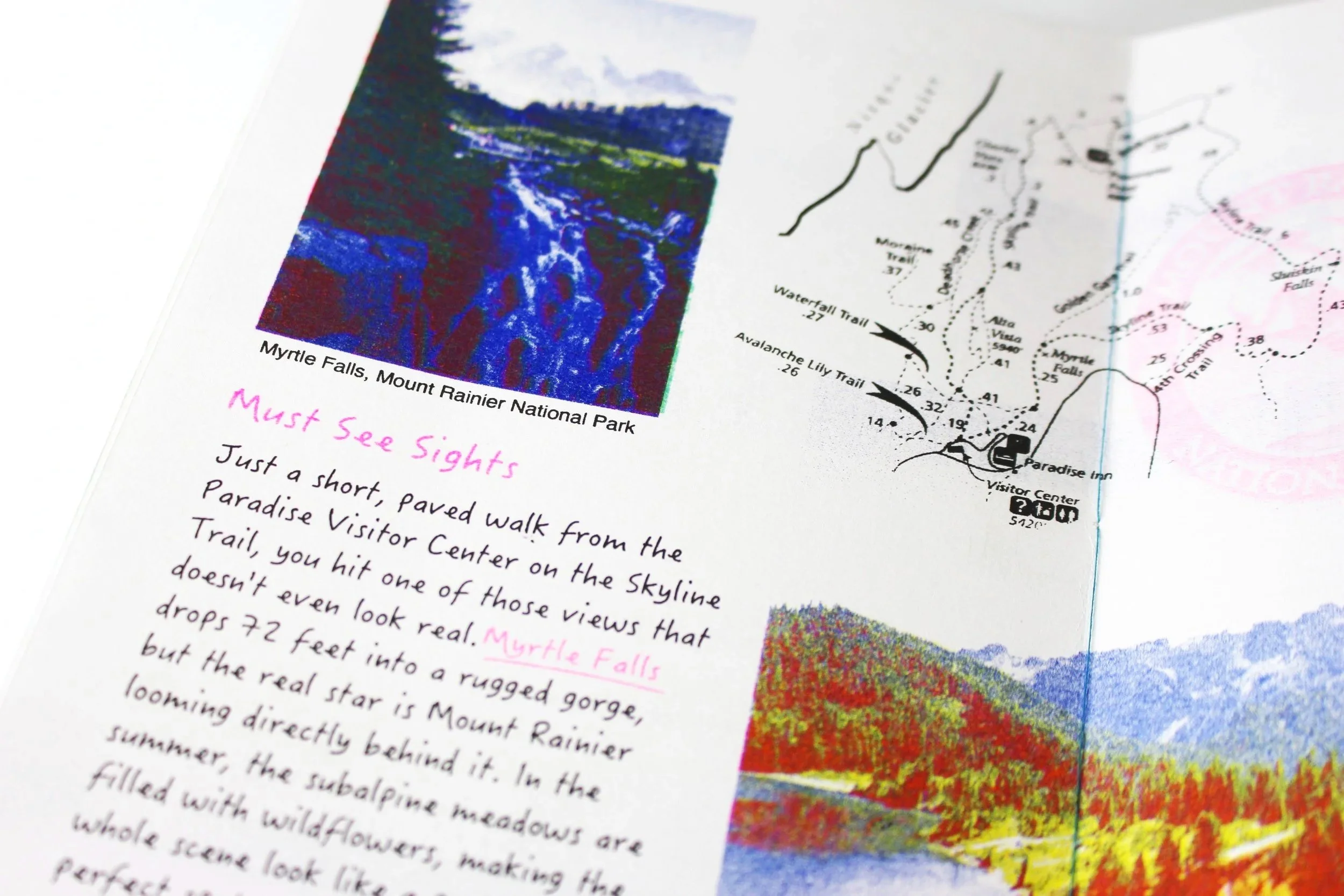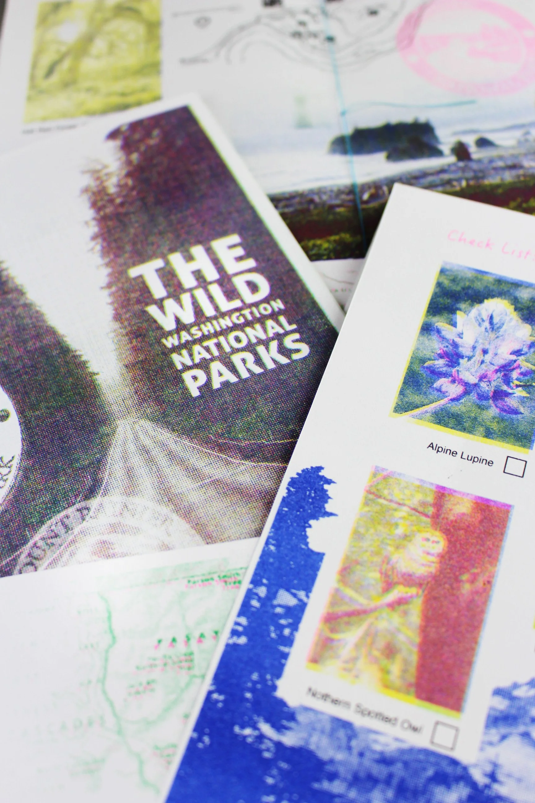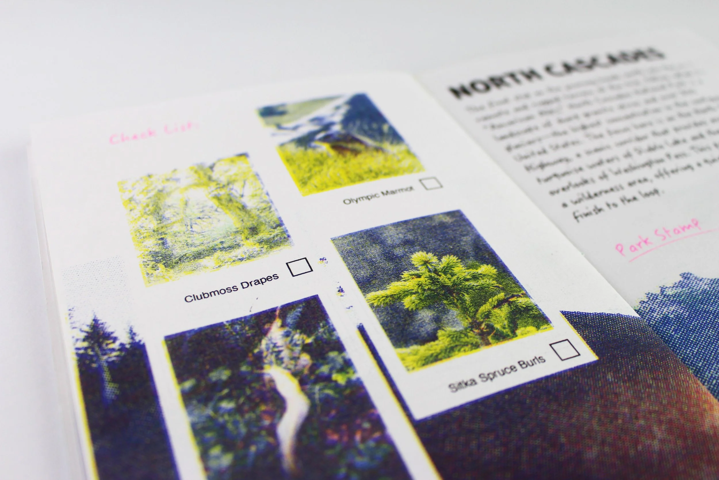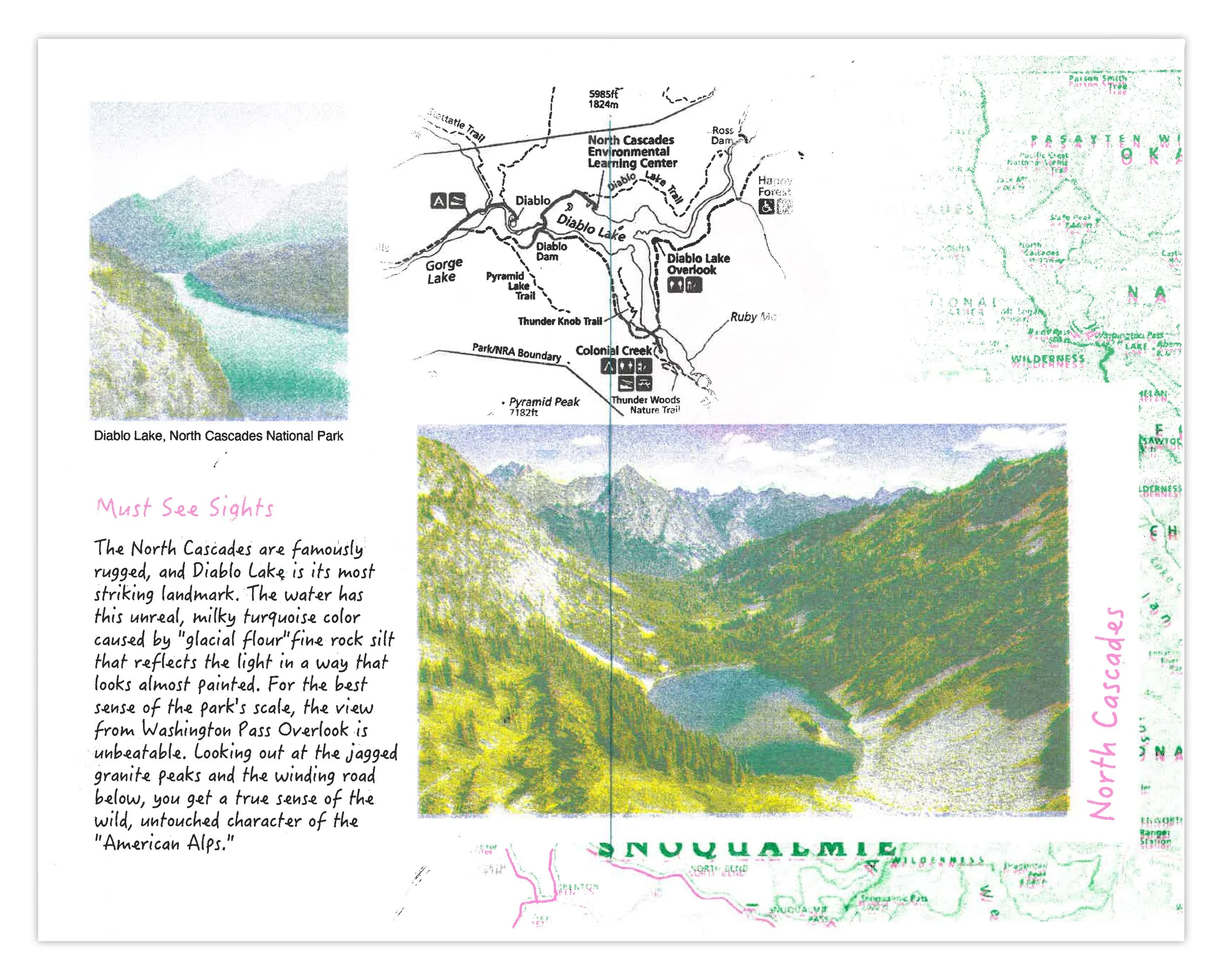 The Wild Washington zine is a tactile exploration of the state’s three distinct National Parks: Mount Rainier, Olympic, and the North Cascades. The project serves as a visual inspiration for a trip I aspire to take, using the design process as a way to research and "map out" the journey. Designed as a hybrid between a functional field guide and a personal traveler’s journal, the zine focuses on the unique textures and geological identities of the Pacific Northwest.